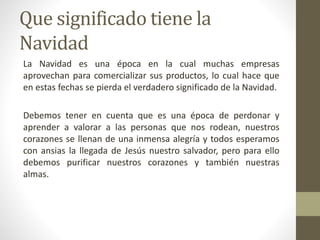 El documento discute el significado de la Navidad y cómo ha sido afectado por el consumismo. Explica que la Navidad se ha vuelto más sobre el consumo y los regalos caros que sobre el verdadero significado de celebrar el nacimiento de Jesús y pasar tiempo con la familia. También describe cómo los niños ahora esperan regalos costosos y cómo los adultos a menudo gastan mucho dinero en regalos en lugar de pasar tiempo de calidad con sus hijos. El documento concluye enfatizando la importancia de cambiar esta perspectiva erró