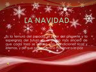 Este documento resume las tradiciones y el significado de la Navidad. Explica que la Navidad conmemora el nacimiento de Jesucristo el 25 de diciembre y cómo se incorporaron tradiciones paganas como los banquetes, el fuego y los villancicos. También describe cómo Santa Claus se convirtió en un símbolo navideño y resume algunas tradiciones como la cena de Navidad y el intercambio de deseos de paz, generosidad y alegría.