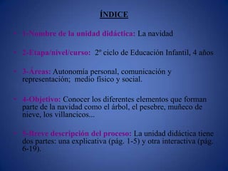 La unidad didáctica 'La Navidad' para el segundo ciclo de educación infantil tiene como objetivo que los niños conozcan diversos elementos asociados a esta festividad. Se compone de una parte explicativa y otra interactiva que incluye actividades como montar un muñeco de nieve, decorar un árbol y cantar villancicos. La unidad se apoya en recursos multimedia como videos de YouTube para enriquecer el aprendizaje.