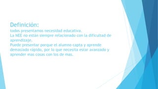 El documento define la necesidad educativa especial (NEE) y discute varios temas relacionados. La NEE no siempre está relacionada con dificultades de aprendizaje y puede presentarse cuando un estudiante aprende demasiado rápido. La integración educativa busca apoyar a los estudiantes con NEE en escuelas regulares. Las NEE pueden clasificarse y ser temporales o permanentes dependiendo de causas físicas, psíquicas o sociofamiliares. La NEE se refiere a cuando un estudiante se encuentra muy por de