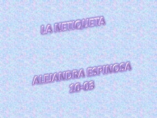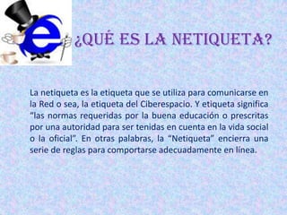 ¿QUÉ ES LANETIQUETA? La netiqueta es la etiqueta que se utiliza para comunicarse en la Red o sea, la etiqueta del Ciberespacio. Y etiqueta significa “las normas requeridas por la buena educación o prescritas por una autoridad para ser tenidas en cuenta en la vida social o la oficial”. En otras palabras, la “Netiqueta” encierra una serie de reglas para comportarse adecuadamente en línea.