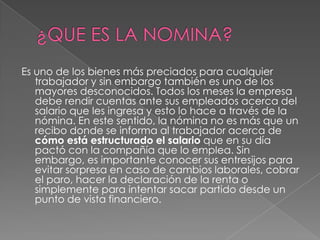 La nómina es el recibo que la empresa emite mensualmente a cada trabajador con el detalle de su salario. Está compuesta por el devengado (ingresos totales), las deducciones (aportes a salud, pensión, etc.) y las apropiaciones (aportes a cargo de la empresa). La nómina permite conocer la estructura del salario y es importante para entender cambios laborales, cobrar el paro o hacer la declaración de renta.