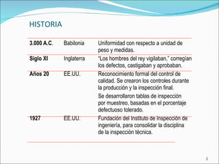 El documento proporciona una breve historia del desarrollo de los sistemas de gestión de calidad a lo largo de los años, desde los primeros controles de calidad en Babilonia en el 3000 a.C. hasta la actual norma ISO 9001 del 2008. Explica conceptos clave como calidad, aseguramiento de calidad y gestión de la calidad, e introduce los principios y requisitos de la norma ISO 9001 para la implementación de un sistema de gestión de calidad.