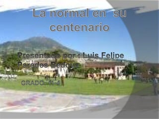 El documento resume la historia y objetivos de la Normal Superior de Pasto en Colombia. Fue creada en 1911 para formar maestros en el departamento de Nariño y el suroccidente colombiano. A lo largo de sus 100 años ha tenido diferentes nombres pero siempre ha cumplido con su misión de educar maestros para la región. La Normal Superior de Pasto ha crecido junto con el departamento de Nariño y ha jugado un papel importante en su desarrollo educativo.