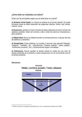 Este documento define la noticia periodística y explica sus características fundamentales. Según varios autores, una noticia es un hecho verdadero, nuevo e interesante para el público que es comunicado por un medio masivo luego de ser seleccionado e interpretado por periodistas. Una buena noticia responde a las preguntas clásicas de quién, qué, cuándo, dónde y por qué sobre el hecho y se redacta de forma concisa, objetiva, simple y coherente siguiendo la estructura de pirámide invertida