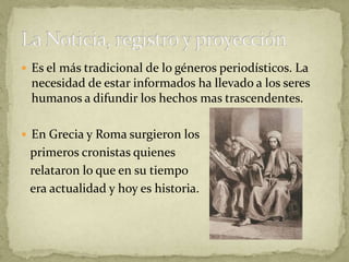 El documento describe la evolución del género periodístico de la noticia desde la antigua Grecia y Roma hasta la actualidad. Explica que la noticia ha evolucionado junto con las tecnologías e incluye ahora antecedentes, conclusiones y análisis para dar mayor contexto al público. También destaca que una buena noticia debe contener información detallada sobre el hecho, sus antecedentes y consecuencias, y comparaciones con casos similares para ofrecer soluciones a la problemática.