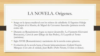 El documento resume los orígenes y la estructura de la novela. Explica que la novela surgió en la Edad Media con los relatos de caballería y alcanzó su mayor desarrollo en el Renacimiento. También clasifica diferentes tipos de novelas como la novela caballeresca, la novela picaresca, la novela histórica y la novela de ciencia ficción. Por último, detalla los elementos estructurales clave de la novela como el argumento, los personajes, el tiempo y el espacio en que se desarrolla la historia.