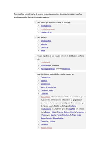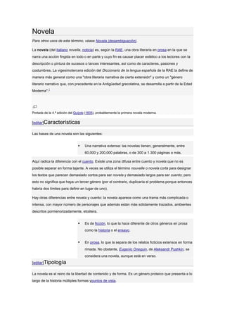 Este documento define la novela y describe sus características y tipologías. Explica que la novela es una obra literaria narrativa extensa, de ficción y en prosa. Detalla los orígenes y precedentes de la novela en las obras de la antigüedad grecolatina y su desarrollo en la Edad Media y Moderna. Señala que la primera novela moderna fue Don Quijote de la Mancha y describe los diferentes tipos de novelas como las novelas históricas, de aventuras, románticas, etc.