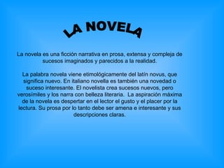 El documento resume la historia de la novela como género literario. Comienza con las primeras novelas en la antigüedad griega y romana, continúa con el desarrollo de la novela medieval en Europa y la picaresca en España en los siglos XVI-XVII, la novela burguesa del siglo XVIII, el auge del realismo y naturalismo en el siglo XIX, y la renovación de técnicas narrativas en el siglo XX. También destaca que Cervantes introdujo el énfasis en el carácter interno del personaje como