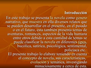 Este documento presenta un resumen de los diferentes tipos de novela y sus características. Describe novelas como la bucólica, satírica, de aventuras, gótica, histórica, policiaca, biográfica, de costumbres, realista y naturalista. Explica que la novela ha evolucionado a lo largo de la historia, abarcando temas como la psicología y los conflictos sociales con nuevas técnicas narrativas. En la novela moderna, los personajes son más complejos y los temas oscuros.
