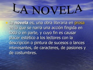 La novela es un género literario en prosa que narra una historia ficticia. Tiene tres características principales: es extensa, de ficción y en prosa. Su origen se remonta a las narraciones épicas antiguas aunque no se estableció como género hasta la Edad Media. En los siglos XVI y XVII surgieron novelas pioneras como Don Quijote que establecieron las bases de la novela moderna. En el siglo XIX alcanzó su madurez con géneros como la novela histórica