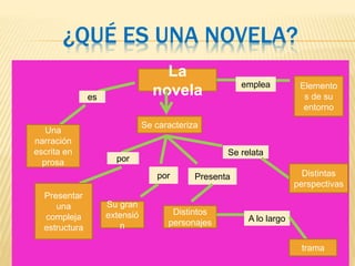 La novela se caracteriza por ser una narración escrita en prosa que presenta una compleja trama y estructura. Presenta distintos personajes y perspectivas a lo largo de la historia, empleando elementos del entorno. Generalmente incluye un marco temporal y espacial, personajes principales y secundarios, y un narrador que presenta los hechos de manera organizada. Las novelas típicamente tienen una estructura con un inicio, nudo y desenlace que presentan, desarrollan y resuelven el problema central.