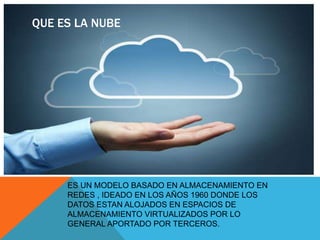 El documento describe la nube como un modelo de almacenamiento en redes donde los datos se almacenan en espacios virtualizados administrados por terceros. Explica que el almacenamiento en la nube permite almacenar, administrar y respaldar datos de forma remota en servidores administrados por un proveedor. También describe los tipos de almacenamiento en la nube como privada, pública y híbrida, así como sus características como autoservicio, acceso de red, elasticidad, medición de servicios y pool de recursos.