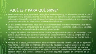 Este documento describe la nube y sus principales usos y servicios. La nube se refiere al almacenamiento y procesamiento de datos en servidores remotos que pueden accederse desde cualquier dispositivo. Algunos ejemplos populares de servicios de nube son Dropbox, Google Drive y OneDrive, que permiten almacenar y compartir archivos en línea de manera fácil de usar.