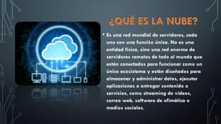 La nube es una red mundial de servidores interconectados que almacenan y administran datos y ejecutan aplicaciones de forma remota. Existen tres tipos principales de nube: pública, privada e híbrida. La nube ofrece ventajas como accesibilidad desde cualquier lugar, recuperación fácil de datos y seguridad, pero también implica costos adicionales y depende de una conexión a Internet confiable.