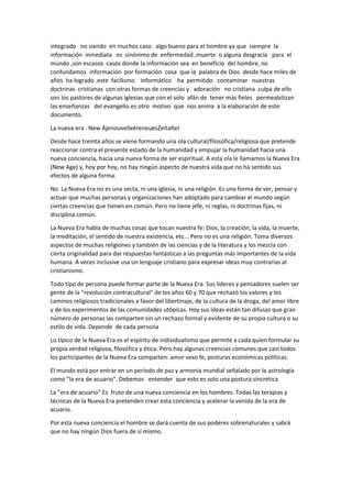 El documento explora la influencia de la nueva era, un movimiento sincrético que mezcla diversas creencias religiosas y espirituales, en la vida contemporánea y especialmente en la doctrina cristiana. Se advierte sobre la permeabilidad de las congregaciones cristianas a estas creencias no cristianas y se destaca la necesidad de una clara separación entre las enseñanzas de Jesucristo y las interpretaciones modernas que intentan redefinir la espiritualidad. A través de un llamado a la comunidad cristiana, se busca reafirmar la importancia de vivir según los preceptos bíblicos en oposición a las doctrinas de la nueva era.