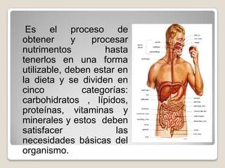 El documento describe los principales nutrientes que componen una dieta balanceada, incluyendo carbohidratos, lípidos, proteínas, vitaminas y minerales. Explica que estos nutrientes proporcionan energía, ayudan a formar tejidos y regulan reacciones metabólicas para satisfacer las necesidades básicas del organismo. Además, detalla las diferentes clases de cada nutriente y algunas de sus fuentes alimenticias.