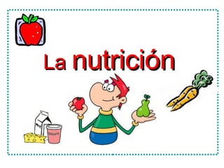 El documento describe los conceptos básicos de la nutrición. Define la nutrición como el proceso de introducir alimentos en el cuerpo y aprovechar los nutrientes contenidos en ellos. Explica que una dieta balanceada consiste en consumir los cuatro grupos de alimentos principales: leche y derivados, carne huevos y pescado, frutas y verduras, y panes pastas y cereales. También menciona algunas enfermedades relacionadas con la nutrición como la obesidad y la diabetes.