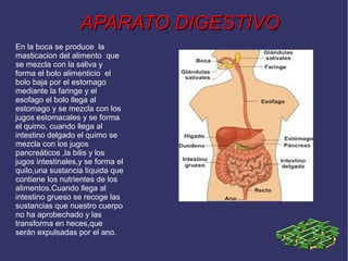Este documento resume los sistemas digestivo, respiratorio y circulatorio. Describe las etapas de la digestión desde la boca hasta el intestino grueso, así como la respiración desde la nariz hasta los pulmones. Finalmente, explica que el corazón bombea la sangre a través de las arterias y venas, y muestra un gráfico sobre los tipos de células sanguíneas.
