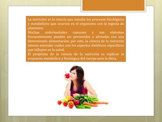 La nutrición estudia los procesos fisiológicos y metabólicos que ocurren con la ingesta de alimentos y cómo una dieta adecuada puede prevenir o aliviar enfermedades. La ciencia de la nutrición intenta entender cómo los aspectos dietéticos específicos influyen en la salud explicando la respuesta del cuerpo a la dieta. Una alimentación adecuada cubre los requerimientos energéticos y de micronutrientes a través de carbohidratos, proteínas, grasas, vitaminas, miner