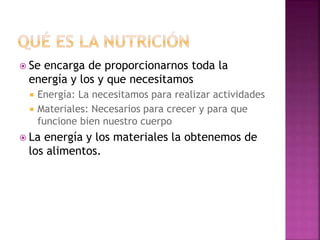 El documento describe los cuatro sistemas principales involucrados en la nutrición: el sistema digestivo, respiratorio, circulatorio y excretor. El sistema digestivo obtiene nutrientes de los alimentos, el sistema respiratorio obtiene oxígeno, el sistema circulatorio distribuye oxígeno, nutrientes y desechos, y el sistema excretor elimina desechos. Juntos, estos sistemas permiten que el cuerpo obtenga energía de los alimentos y oxígeno a través de procesos complejos de digestión, respiración y circulación.