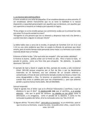 Este documento habla sobre el pecado bíblico de la envidia. Define la envidia como pesar o disgusto por el bien o prosperidad de otros. Explica que la envidia corroe los huesos según la Biblia y existe en todas las esferas sociales e incluso en la iglesia. También describe algunos efectos negativos de la envidia como no apreciar lo que uno tiene, empequeñecer el alma y llevar a pensamientos y acciones malas como el homicidio. Usa varios ejemplos bíblicos como Ca