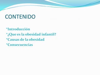 El documento describe la creciente tasa de obesidad infantil en México y sus causas y consecuencias. Más del 40% de los niños en México sufren de sobrepeso u obesidad debido a factores genéticos y cambios en los hábitos alimenticios y de actividad física como el mayor consumo de comida chatarra, bebidas azucaradas y la falta de ejercicio. La obesidad infantil puede conducir a problemas de salud a corto y largo plazo como hipertensión, colesterol alto, diabetes e incl