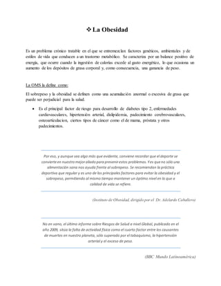 El documento aborda la obesidad como un problema crónico influenciado por factores genéticos, ambientales y de estilo de vida, destacando la importancia de la actividad física en su prevención. Se clasifican diferentes tipos de obesidad y sus riesgos asociados, como enfermedades cardiovasculares y diabetes tipo 2, además de abordar las causas y efectos de la obesidad en la salud. También sugiere medidas tanto a nivel individual como social para reducir la obesidad, enfatizando el acceso a estilos de vida saludables.