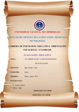 Este documento describe la observación como una técnica importante de evaluación educativa. Explica que la observación permite que los docentes evalúen las habilidades, destrezas y conocimientos adquiridos por los estudiantes. Luego detalla algunos instrumentos comunes de observación como registros, listas de verificación y escalas. También provee una guía para realizar observaciones de manera efectiva y minimizar errores. El documento concluye que la observación es una técnica esencial que ayuda a los docentes a conocer mejor a los estudiantes y
