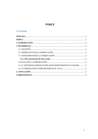 Este documento describe la observación como una técnica importante de evaluación educativa. Explica que la observación permite que los docentes evalúen las habilidades, destrezas y conocimientos adquiridos por los estudiantes. Luego detalla algunos instrumentos clave de observación como registros, listas de verificación y escalas. También proporciona una guía para realizar observaciones en el aula de manera efectiva. El documento concluye que la observación es una técnica esencial que ayuda a los docentes a conocer mejor a los estudiantes