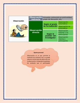El documento describe diferentes técnicas de observación para la evaluación. Explica que la observación consiste en utilizar los sentidos para observar hechos y realidades sociales. Luego detalla cinco funciones de la observación: descriptiva, formativa, evaluativa, heurística y de verificación. Finalmente, distingue entre observación directa e indirecta, sistemática y no sistemática, y externa o participante.