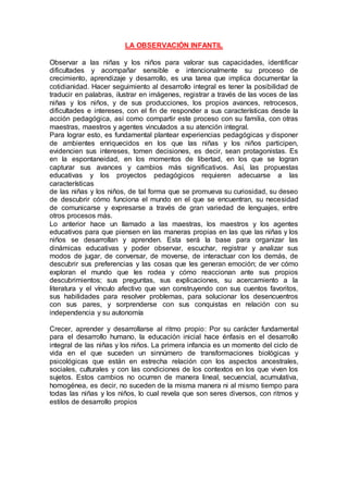 Observar a los niños para evaluar sus capacidades y desarrollo integral implica documentar su cotidianidad, registrando sus avances, dificultades e intereses a través de palabras, imágenes y las voces de los niños, con el fin de responder a sus características individuales y compartir este proceso con sus familias y maestros. Para lograr esto, es fundamental plantear experiencias pedagógicas y ambientes enriquecidos donde los niños participen y sean protagonistas, ya que en la espontaneidad y libertad se capturan sus avances más significativos.