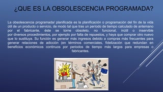 La obsolescencia programada se refiere a la planificación de una vida útil limitada para productos con el fin de generar más ventas. Los fabricantes diseñan productos para dejar de funcionar después de cierto tiempo para obligar a los consumidores a comprar versiones nuevas, priorizando las ganancias sobre la calidad y el medio ambiente. Esto genera residuos excesivos. Algunas formas de luchar contra esto incluyen sellos que certifican productos sin obsolescencia programada y promueven la reparación.