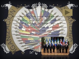 La Organización de los Estados Americanos (OEA) es el organismo regional más antiguo del mundo, establecido originalmente en 1890 y formalmente en 1948 para promover la cooperación entre sus 35 estados miembros y defender la soberanía, integridad territorial e independencia de sus estados miembros. La OEA se basa en pilares como la democracia, derechos humanos, seguridad y desarrollo para lograr la paz, justicia y colaboración en el hemisferio.