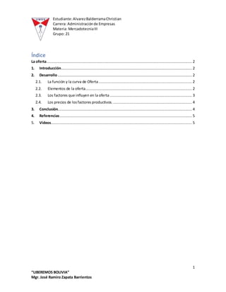 Este documento explica los conceptos de oferta y los factores que influyen en ella. Define la oferta como la cantidad de bienes y servicios que los oferentes están dispuestos a poner a la venta a ciertos precios. Explica que la cantidad ofertada depende principalmente del precio, de acuerdo a la ley de la oferta. También menciona otros factores como los precios de los factores productivos, la tecnología, las expectativas empresariales y el número de productores.