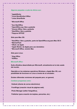 El documento describe las principales herramientas de ofimática, incluyendo procesadores de texto (Word), hojas de cálculo (Excel), presentaciones (PowerPoint) y bases de datos (Access). Explica que forman parte de paquetes o suites ofimáticas como Microsoft Office, OpenOffice y Google Docs. Cada aplicación tiene pestañas con herramientas para crear, formatear y revisar diferentes tipos de documentos de oficina.