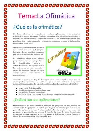El documento habla sobre la ofimática. Define la ofimática como el conjunto de técnicas y herramientas informáticas que se usan para optimizar tareas de oficina como la creación, manipulación y almacenamiento de información. Describe que las aplicaciones más comunes de ofimática incluyen procesadores de texto, hojas de cálculo, bases de datos y presentaciones. También menciona que los paquetes de ofimática más populares son Microsoft Office y OpenOffice.