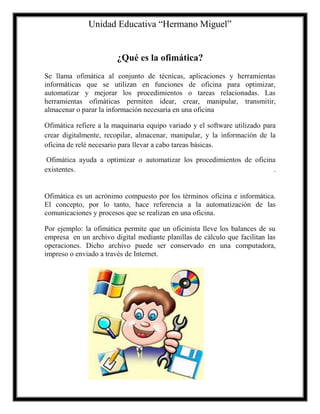 La ofimática se refiere al conjunto de aplicaciones y herramientas informáticas utilizadas para optimizar y automatizar las tareas de una oficina. Algunos de los principales paquetes de ofimática son Microsoft Office, OpenOffice y suites libres como KOffice y Gnome Office, los cuales incluyen aplicaciones como procesadores de texto, hojas de cálculo y presentaciones. La ofimática ha evolucionado desde máquinas de escribir y fotocopiadoras hasta suites completas en computadoras personales que permiten automatizar tareas administrativas.