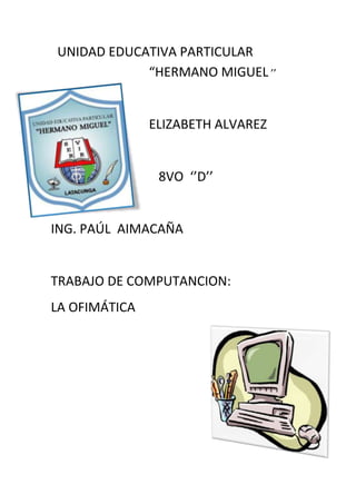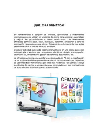 El documento habla sobre la ofimática. Explica que la ofimática se refiere al conjunto de técnicas y herramientas informáticas que se usan en las oficinas para optimizar y automatizar tareas como el procesamiento de texto, hojas de cálculo, bases de datos y presentaciones. También describe algunos de los paquetes de ofimática más populares como Microsoft Office y OpenOffice, los cuales incluyen aplicaciones como Word, Excel, PowerPoint, Access y otras herramientas.