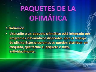 La ofimática se refiere al conjunto de técnicas y herramientas informáticas como Microsoft Office y OpenOffice.org que se utilizan para optimizar y automatizar tareas de oficina como la creación, manipulación, almacenamiento y transmisión de información. Algunas de las aplicaciones más comunes son hojas de cálculo, presentaciones y procesadores de texto que permiten realizar funciones de oficina de manera más eficiente.