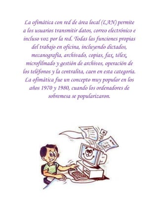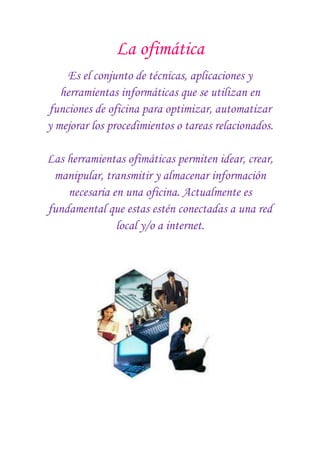 La ofimática se refiere al conjunto de técnicas, aplicaciones y herramientas informáticas que se utilizan en funciones de oficina para optimizar y automatizar tareas relacionadas. Las herramientas ofimáticas más utilizadas actualmente son los procesadores de texto, las hojas de cálculo y las presentaciones en diapositivas, como Microsoft Word, Excel y PowerPoint. Estas herramientas permiten crear, manipular, transmitir y almacenar información necesaria para el trabajo en una oficina de manera conectada a una red local o internet