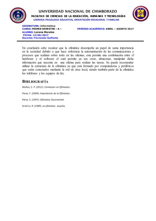 El documento describe la ofimática y sus herramientas que se utilizan para optimizar y automatizar tareas en oficinas. La ofimática permite crear, compartir y almacenar información entre usuarios de manera online. Además, las herramientas de ofimática como procesadores de texto, hojas de cálculo y presentaciones ayudan a mejorar la organización de actividades en empresas y organizaciones. Finalmente, la ofimática desempeña un papel importante en la automatización de comunicaciones y procesos en oficinas mediante el uso de hardware, software