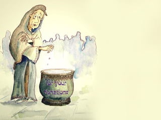 Jesús observó a la gente dando ofrendas en el templo. Muchos ricos dieron grandes cantidades de dinero, pero una viuda pobre solo puso dos pequeñas monedas, a pesar de que valían muy poco. Jesús dijo que la ofrenda de la viuda fue más valiosa porque ella dio todo lo que tenía para vivir.