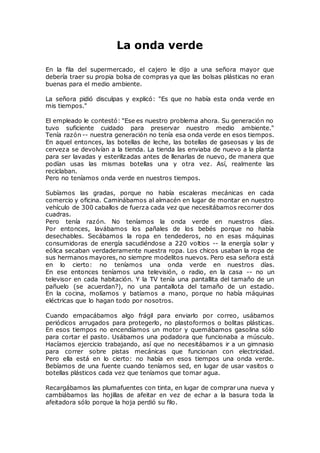 El documento describe cómo las generaciones anteriores no tenían conciencia ambiental como la "onda verde" actual. En el pasado, las personas reutilizaban botellas y envases, caminaban en lugar de conducir, secaban la ropa naturalmente, y reparaban artefactos en lugar de desecharlos. Sin embargo, la generación actual critica a las generaciones pasadas por no haber preservado mejor el medio ambiente.