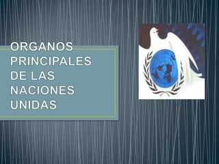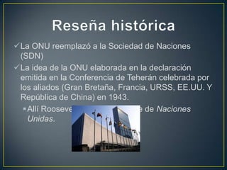 La ONU reemplazó a la Sociedad de Naciones y fue creada en 1945 tras la Segunda Guerra Mundial. Tiene como objetivos principales mantener la paz y seguridad internacionales, fomentar las relaciones de amistad entre las naciones y promover el progreso social y los derechos humanos. Está compuesta por 193 estados miembros y sus principales órganos son la Asamblea General, el Consejo de Seguridad, el Consejo Económico y Social y la Secretaría.