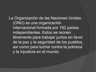 La Organización de las Naciones Unidas (ONU) es una organización internacional formada por 192 países independientes. La ONU trabaja para mantener la paz mundial, respetar los derechos humanos, y ayudar a mejorar las condiciones de vida en todo el mundo a través de seis órganos principales como la Asamblea General y el Consejo de Seguridad. La ONU y sus agencias especializadas abordan problemas globales como la pobreza, el medio ambiente, y los derechos humanos.