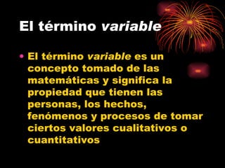 El documento explica los conceptos de operacionalización, variable, clasificación de variables, elementos de las variables e indicadores. La operacionalización se refiere a desglosar hipótesis en componentes empíricos mediante deducción lógica. Una variable es una propiedad que toma valores cualitativos o cuantitativos. Las variables se clasifican en concretas o abstractas, y cualitativas o cuantitativas. Los elementos de una variable son su signo, dimensión e indicadores.