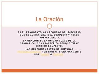 La oración es la unidad básica de la gramática que comunica una idea completa y está delimitada por pausas o puntuación. Existen dos clases principales de oraciones: coordinadas, que unen dos proposiciones independientes mediante conjunciones, y subordinadas, donde una proposición depende de la otra a través de enlaces subordinantes. Las oraciones también pueden unirse yuxtapuestas, sin nexos entre ellas.