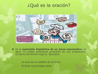 El documento define la oración como la unidad gramatical que expresa una proposición. Explica que hay tres criterios para analizar la oración: sintáctico, morfológico y semántico. Describe la estructura básica de la oración, incluyendo el sujeto, predicado, verbos y otros elementos. Finalmente, explica los tipos de oraciones compuestas, como las copulativas, disyuntivas, adversativas y yuxtapuestas.