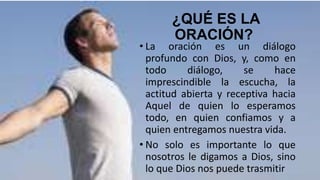 La oración es un diálogo profundo con Dios donde debemos escuchar y estar abiertos a lo que Él quiere transmitirnos. Orar no es para informar a Dios sobre nuestra vida, ya que Él lo conoce todo, ni para obligarlo a cambiar sus propósitos. Más bien, la oración sirve para prepararnos para decisiones importantes, derrotar la actividad demoníaca, fortalecernos espiritualmente y fortalecer a otros. Debemos orar constantemente en cualquier lugar y con humildad, contándole a Dios todo lo